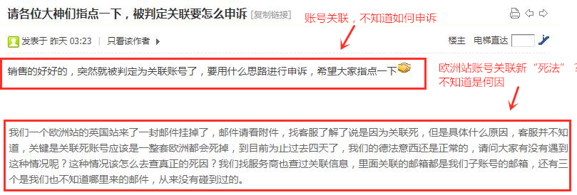 需要注意的是,如果卖家有任何销售不佳的账户,亚马逊很可能会停用你的所有管理账户。 就目前而言,卖家使用一套资料在同一站点注册多个账号肯定是会关联的并可能会直接被冻结。因此,卖家的注册资料非常宝贵,一旦死账号,资料可能就作废了,申诉也比较难。 如果亚马逊允许卖家使用一套资料在同一站点创建多个账户的话,那肯定是重大利好的消息,账号关联影响也有可能会降低。但目前一切未知,不知道在哪几种情况下可以创建多账户,卖家们可以留意一下,在政策详细内容未公布之前,切勿盲目操作。 2 是否有数量限制?除了欧洲站,其他站点呢? 与此同时,船长注意到,亚马逊目前只在欧洲站发布了这则通知,其他站点尚未看到,也就是说如果政策变更内容如卖家群和其他自媒体所传闻的那样,那么,在政策变更后,亚马逊欧洲站或可能首先成为支持卖家创建多账户的站点,其他站点有待亚马逊后续通知。 但无论如何,账号关联不会因此而消失。这次政策变更后,创建多账户也只能在几种有限的情况下进行,而且很大可能还会有可创建的账户数量限制,不是每个卖家都一定能满足要求,还需要看后续亚马逊「销售政策和卖家行为准则」具体的变更内容。因此,账号关联问题千万不能忽视! 账号 关联 详细指南 1 什么是账号关联? 账号关联分为「同站关联」和「异站关联」,相较于后者,前者更容易被亚马逊发现并被封号。大家都知道,亚马逊不允许同一个卖家使用相同的注册信息在同一个站点上创建多个销售账户。亚马逊会通过技术手段,检测卖家的相关信息,通过匹配关联因素,判断多个店铺账号是否属于同一卖家。 只要是超过亚马逊政策限制外的情况都有触发账号关联的可能,卖家需要特别注意。 2 亚马逊为什么要设置「关联」来限制卖家? 通俗的讲就是亚马逊为了给买家提供更好的购物体验,防止卖家创建多个店铺来破坏平台的运营秩序。例如,当买家在搜索产品时,可能出现的都是同一个卖家店铺的雷同产品,因此,亚马逊会在一定程度上限制同一卖家的账号数量。 3 亚马逊如何判定关联/触发账号关联的因素? 亚马逊对于账号关联的判定因素有很多,一般是利用技术手段,再通过系统的自动检测、识别和判定的。 账号被关联了,很难说具体是哪一个因素触发了关联,有可能是单一因素触发的,也有可能是多因素综合判定而触发的。 通常情况下,亚马逊判定账户关联的因素有以下几类 硬件类 电脑、网线/IP地址、路由器信息、猫、网卡MAC、硬盘信息等 尽可能采取独立的电脑和独立的网络来运营独立的账号,避免在同一电脑或网络下登录多个账号。可以采用无线上网卡的方式,不同的无线上网卡对应于不同的账号,且要确保电脑、网络、账号三位一体一一对应。另外,一个账号可以在多台电脑、多个网络环境下登录,但这台电脑和网络登录过某个卖家账号,就不要再登录其他卖家账号。 软件类 浏览器、cookie记录、输入法、字体、存储路径、浏览习惯等 这部分卖家着重要注意的是自己使用的浏览器和操作习惯。 注册信息类 公司名称、个人姓名、信用卡、地址信息、电话号码、邮箱、收款账号等 亚马逊允许使用同一套资料注册不同站点账号,但切勿不要使用同一套资料在同一个站点注册多个账号,注册多个账号,资料信息一定要区分开。 产品类 产品相似度<30%、类目、价格、图片、产品描述内容、运营手法等 建议卖家在发布产品时尽量在不同的店铺里发布不同的产品,如果产品有限,而又想将所有产品同步发布在多个店铺中,最好在产品图片、描述、SKU等内容上做出区别,不要用完全相同的产品信息在多个账号中多次重复发布。 商标类 使用被封店铺已备案商标 不要把已经被封账号的已备案商标应用于其他账号的店铺上。 其他类 跟卖已死账号产品、欧洲站卖家因为KYC审核而导致的账号关联等 别跟卖已死的账号销售的产品,KYC审核方面则需要注意的是,如果你的公司有多个股东,对于股份高于20%的股东都需要提交股东个人资料供平台审核。避免其中某个股东先后出现在两个进行KYC审核的亚马逊账号中,账号易被关联。 4 账号关联可能会产生哪些后果? 一旦账号关联后,可能会产生以下几种结果 1 强制下架新账号的所有Listing 或移除销售权 相同站点的几个账号关联,如果账号之间所销售的产品有交叉,亚马逊会强制下架新账号的全部Listing,严重的可能会直接移除销售权。 2 封停新账号,保留旧账号 针对一个旧店铺和一个新店铺关联情况,亚马逊可能会视店铺表现情况,保留你的旧店铺,直接关闭你权重较低的新店铺。 3 直接封停所有账号 这是最严重的情况,账号越多,关联风险越大,亚马逊将直接封停你所有关联的账号,然后会向你发送警告邮件,申诉可能比较难。 (图源卖家论坛) 5 如何避免账号关联? 1 账号注册:尽量采用招商经理链接注册 同套资料注册不同站点店铺时,同一台电脑注册的时候最好是采用不同浏览器,例如一个火狐一个谷歌,如果使用超级浏览器等软件注册,建议用一个IP绑定一个店铺使用。 注册的时候,注意账号信息,特别是信用卡,后期可以更换同一个,但注册时最好用不一样的。 账号注册成功之前尽量不要去绑定联合账号。 2 绝缘法:给每个店铺都配备独立的网线和电脑 这种方式对于只有两三个店铺的卖家是可行的,但是代价就是