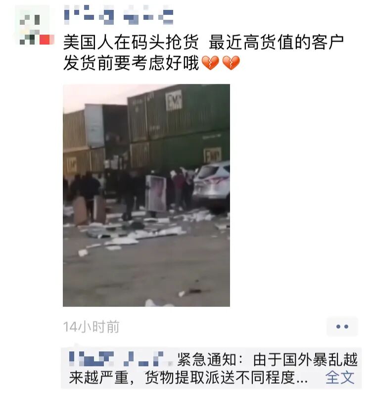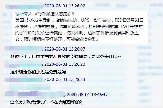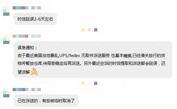 今日,有卖家爆料,根据他们公司买手邮件反馈,在美国暴乱较为严重的地区,亚马逊开始主动取消买家订单,把钱退给客户,并且会发送一封邮件告知因为无法配送,从而取消。 还有卖家反馈,自己在UPS后台查询物流,结果发现包裹被报告损坏了。大家担心的事情都开始陆续发生,所有的卖家都在一夜之间陷入恐慌和担忧,怕货物被抢,更怕暴乱在短期内无法平息。 (图片来源:UPS官网截图) 从UPS和FedEx货车遭洗劫,到亚马逊货车被抢光,没想到码头集装箱也难逃一劫,大量集装箱货物遭示威者围抢,场面十分混乱,高货值产品卖家面临着巨大亏损。 (图片来源:朋友圈截图) 更为气愤的有些示威者趁火打劫,把在奢侈品店和亚马逊货车抢来的高价值货物拿来摆摊。 (图片来源:朋友圈截图) 因为美国暴乱的持续,游行示威活动扩大,今日小编朋友圈被各种货代和物流商刷屏了,大家都在发布紧急通知,告知卖家现在的物流情况,主要有以下几点: UPS 和FedEx无取件派件服务 因为暴乱升级,现在尾端UPS 和FedEx都会有些延误派送,有货代发布通知表示,由于美国当地暴乱,UPS 和FedEx无取件派件服务,也基本瘫痪,已经清关放行的货物将暂放仓库,待局势稳定后在派送,部分在派送的,已经被临时取消。 2.美西仓库出库订单延迟 据了解,有物流商发布通知表示,由于美西仓库所在地附近发生大规模游行示威活动,政府已经发布宵禁命令,紧急宣布宵禁提前,因此库内出库订单操作时效会有部分订单滞留顺延至隔天处理,出库订单运转会出现不同程度延误情况。 3.洛杉矶宵禁提前 洛杉矶宵禁从原来的6点改为4五点,仓库下班时间修改为5点30分。 (图片来源:朋友圈截图) 4.码头long beach下午后不再安排提柜 码头long beach从4点开始宵禁,为了司机和仓库人员的安全,码头提柜下午之后就不会安排。 对此,卖家们一定要提前知晓,做好相应准备,和客户及时沟通。 现在各种猜测加大了卖家的恐慌,但并没有得到证实,卖家千万勿传谣言,勿信谣言。 值得一提的是,一则“卖家FBA货件正在被抢的通知”截图在各大跨境电商交流群流传,截图内容显示:卖家货物正在被抢状态,没有被库房标记完成所有包裹check in,若货物后期出现货件差异,请卖家通过后台查询。 对此,卖家也表示,截图略假,不像是亚马逊会发的通知,娱乐娱乐就可以。 随着货物被抢事件频频发生,很多卖家都开始担心起一个问题:若货物在运输途中被抢,会有人为此负责吗? 有卖家咨询律师后表示,美国此次暴动是全国范围的,在定性上可以归属于不可抗力;货代如果提前通知客户,有相关风险,卖家仍然一意孤行,在这种情况下货代是可以免责的。 但根据卖家反馈,货代很大可能性是不会赔偿,因为属于政治暴乱,不属于承保范围,有些货代已经发布通知告知,不予赔偿 。 如果产品货值较高,卖家在头程有购买货代保险,或相关协议有说明赔偿的话,是可以申请赔偿的。 但现在至关重要的是谨慎发货,避开高风险区,若有足够的库存,可以暂时先不补货。还要及时关注物流动态,保持与物流商和买家的沟通。