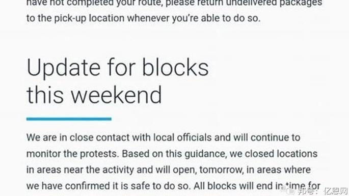 不久前,在美国加州圣莫尼卡,抗议示威者抢劫了一辆亚马逊送货车,这下亚马逊官方给每个站点紧急下达了指令:本周六亚马逊向在芝加哥和洛杉矶的送货司机发送了一则通知,通知称:“如果你现正在送货,立即停下来回家。如果你的送货任务还没有完成,请返回并且将未交付的包裹交还到取货的位置。”通知已发送给包括明尼阿波利斯,西雅图,洛杉矶,纳什维尔和迈阿密在内的近十二个城市的司机。