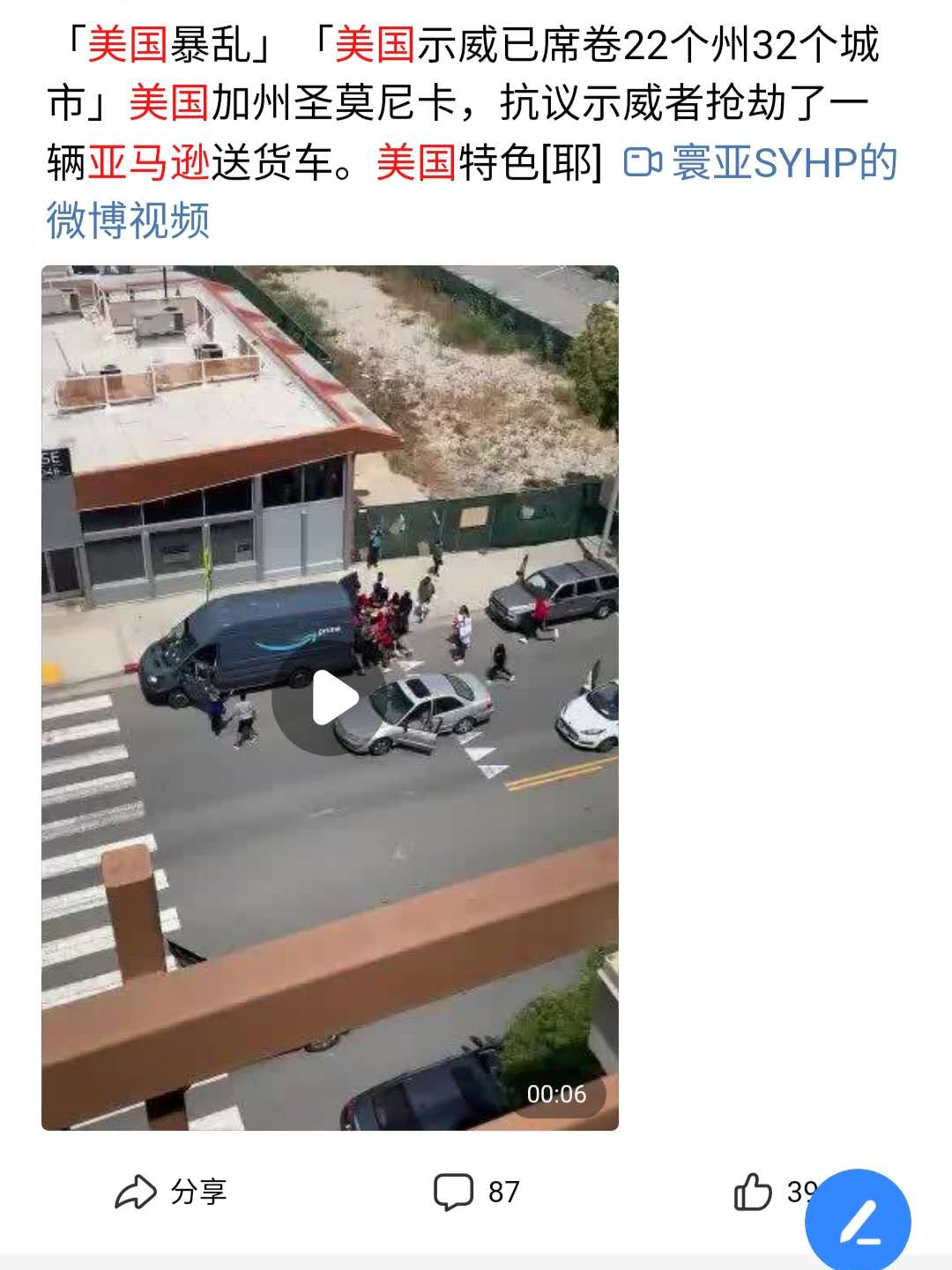 有抗议示威者抢劫了一辆亚马逊送货车,UPS卡车被示威者砸坏,包裹也遭到洗劫。
