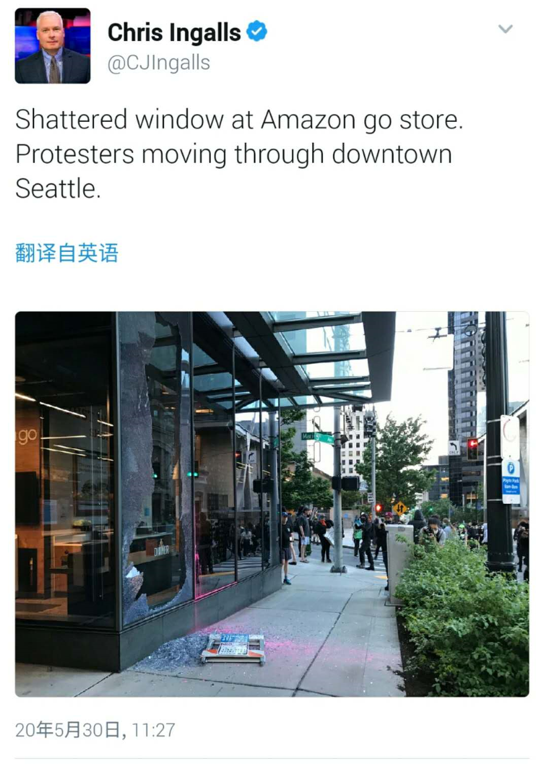 在西雅图市中心,示威者砸碎了亚马逊Go商店的玻璃。