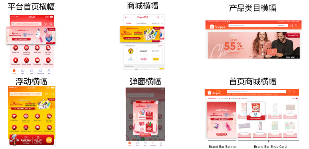Shopee首页的横幅轮播图、商城页面的横幅、产品类目的横幅以及一些动态的展示 比如浮动横幅和弹窗,都会高频率地展示商城中的品牌,使得进入商城的品牌会在最短的时间内把品牌打响。