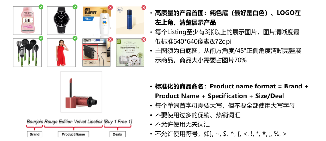 基础要求!白底,Logo在左上角,商品要占到图片的70%,此外还有展示角度、主图的张数、像素的要求等等。