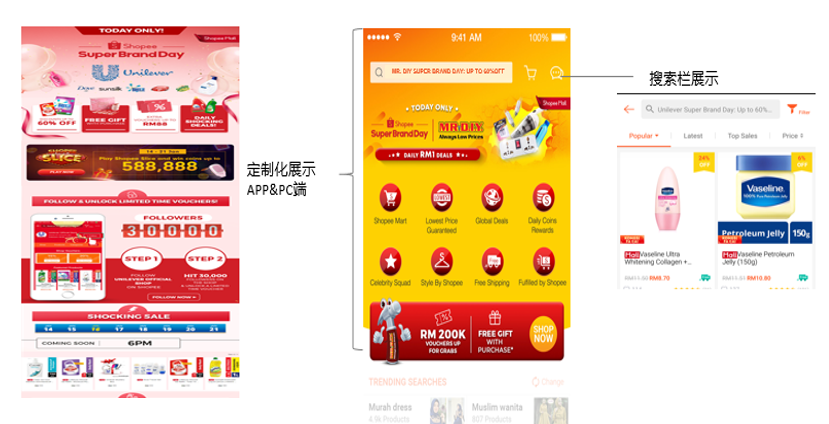 Shopee Mall的商店广告也是非常醒目且独特的,该广告的特权仅向商城卖家开放。此外商城卖家其实对所属品牌关键词也是有个独享权,搜索相关的品牌词,出现的商店和醒目商品都是商城卖家的店铺和SKU。