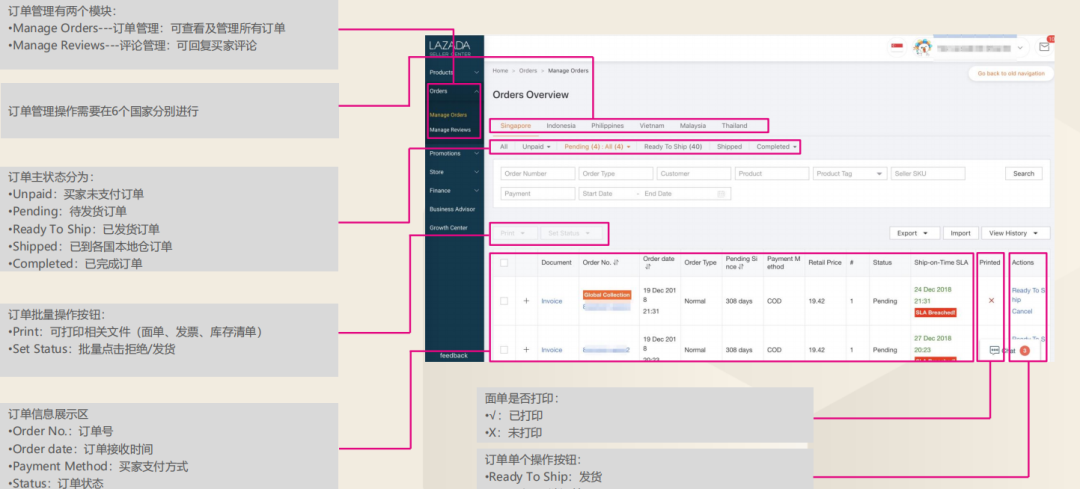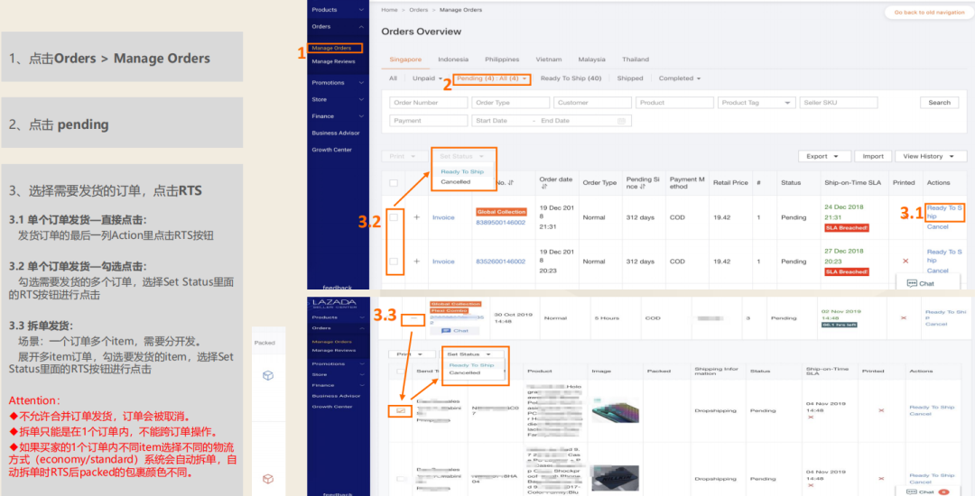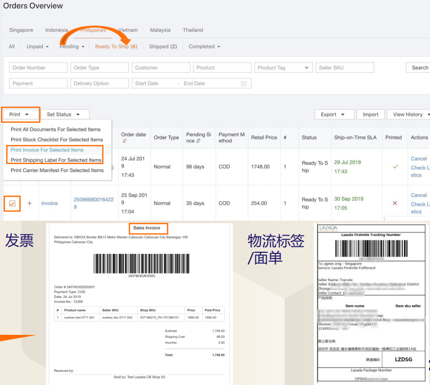 Lazada的发货流程比较简单,只要卖家从系统中打印出国际面单,贴在包裹上面,然后找个国内的物流公司,寄到深圳或义乌分拣中心就行,具体的我们往下看: 01 订单打印 1、进入订单管理界面 2、选择有订单的ASC站点(马来、新加坡、泰国、菲律宾、印尼或越南) 3、选中订单(点击订单前面的方框)>点击点单后面的Ready to ship或订单上方的“设置状态”菜单栏的Ready to ship>选择分拣中心(深圳40或义乌41)>系统自动生成运单号,发票代码可随意填写(填写数字1也可)>保存发票代码>点击Ready to ship>关闭 4、此时,订单会由Pending状态更改到Ready to ship状态,点击打印订单,将发票和订单(国际面单)打印出来即可(发票可要可不要,卖家自行决定) 5、打包好包裹,贴上国际面单,找一个快递公司,寄到深圳或义乌分拣中心(根据打印国际面单时选择的分拣中心投递) 6、包裹到达分拣中心,并经平台扫描后会出现Scan in状态,此后由平台负责派送到客户手中,卖家只用关注状态就可以了 02 注意事项 1、时效 订单产品后48小时内,要将订单从Pending状态更改为Ready to ship状态(操作方法如上),5个日历日内将包裹寄到分拣中心 2、包裹要求 国际面单尺寸:10*15cm(其他尺寸也行,注意条码保持清晰) 包裹:长宽高之和小于300cm,重量小于20kg,如果超过的,注意拆分订单(点击查看) 3、无货源模式 需要卖家找一个做代贴单的服务公司(自己找不到的可用这家) 客户下单后,卖家在淘宝或1688下单,将包裹寄到代贴单公司,同时在他们系统上传国际面单的PDF版本 4、联系分拣中心 分拣中心只接受包裹,上面留的联系方式平时无人接通,卖家有任何问题只能通过发工单的方式处理