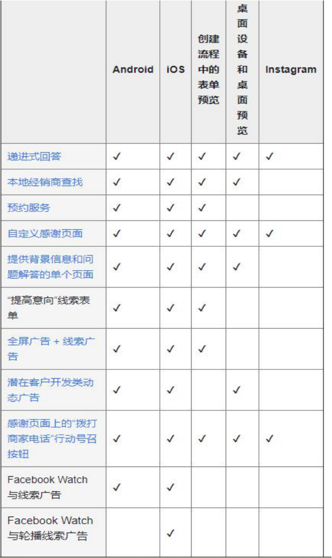 下方表格列出了当前提供的各种线索广告功能(纵向)以及它们适用的平台 (横向):