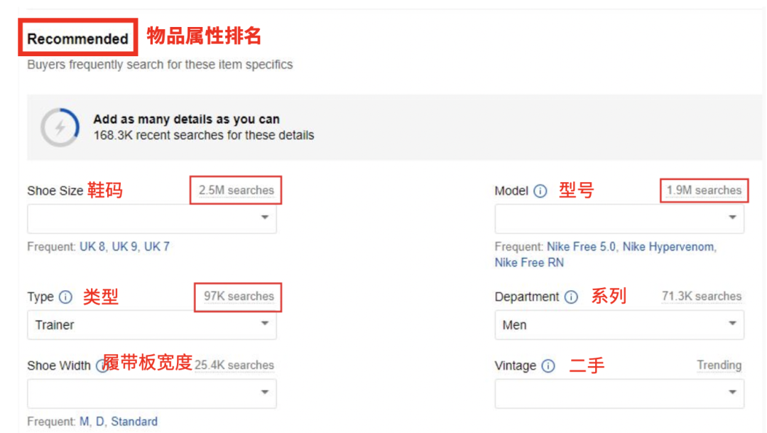 ✔物品属性排名。在刊登流程中,此功能将利用买家需求数据(过去30天内的搜索次数),向卖家提供有关买家正在搜索的重要物品属性的指南。