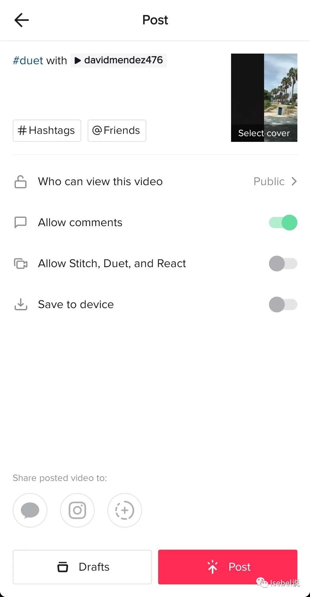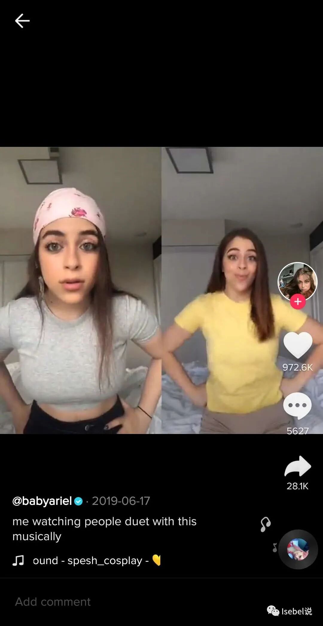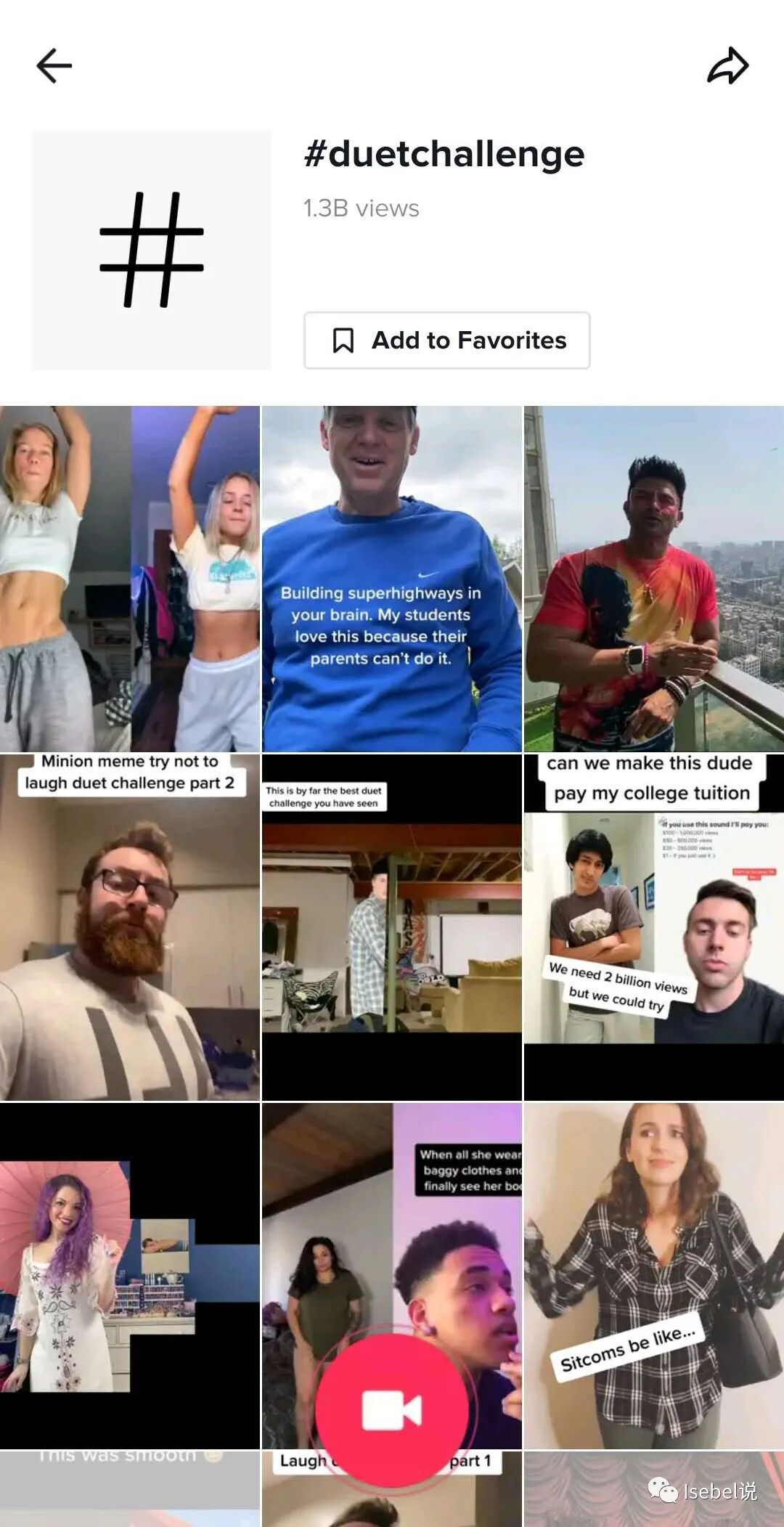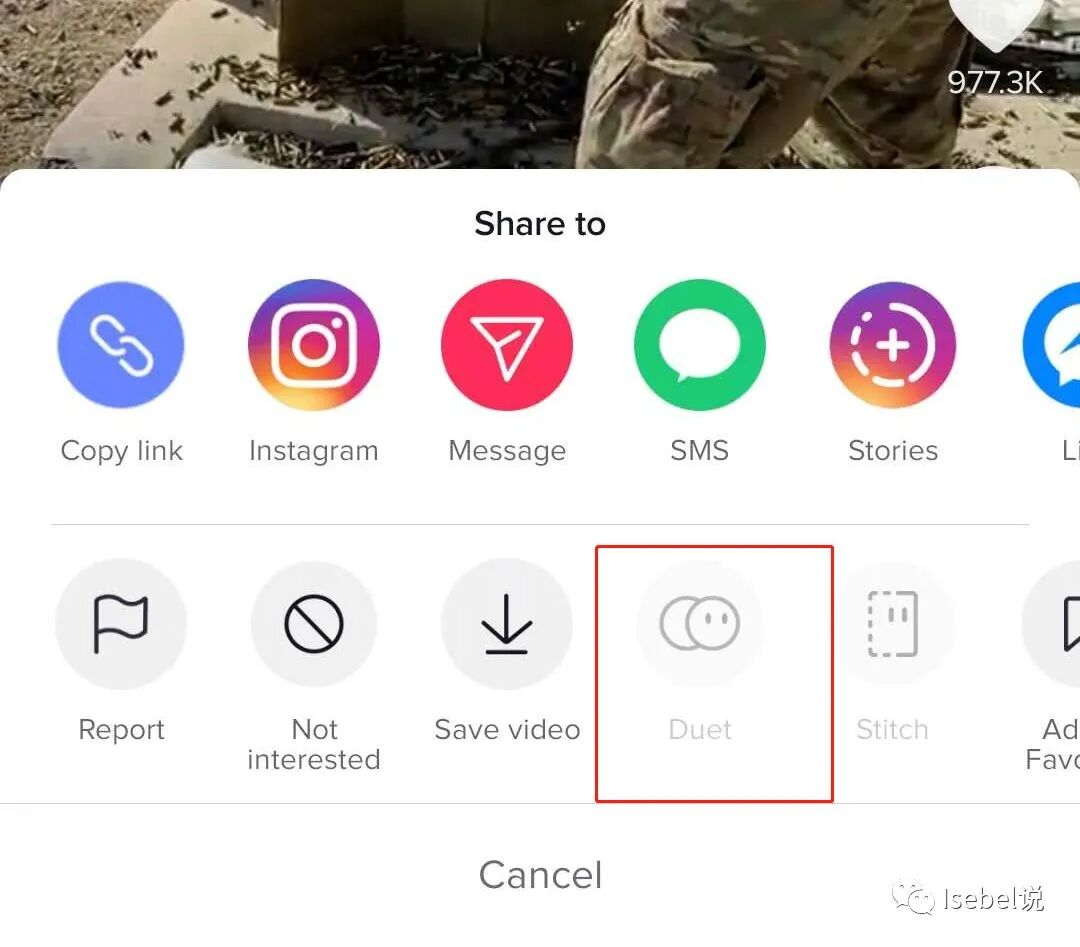 其实这种视频制作很简单,主要使用的就是这里的这个功能,叫做“Duet",一般并不是每个视频都默认开了该功能,这个需要博主发视频的时候进行授权。