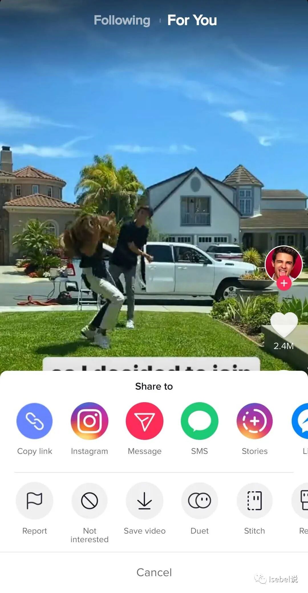 点击视频右侧的共享按钮。仅当创建者允许共享时,它才可见。比如这张是不可见的。(画面敏感就只放一部分)