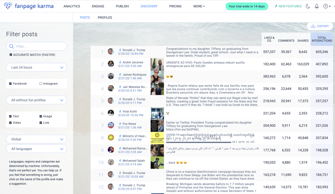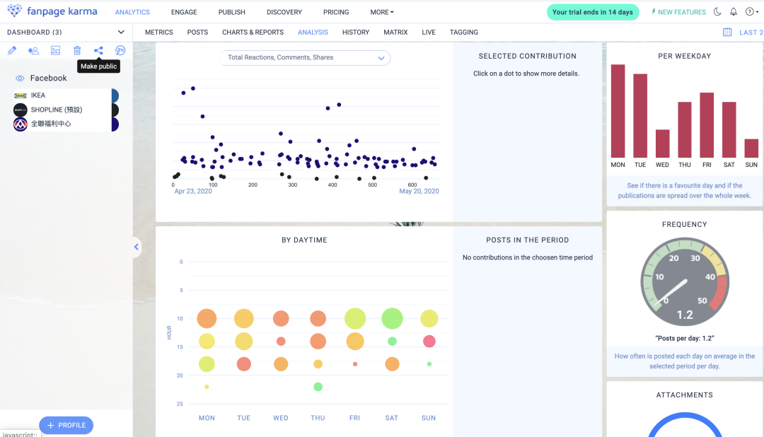 Fanpage Karma 虽然属于社群管理工具,但却兼有社群监测的功能。用户可根据自身功能需求选择免费版或者付费版。此工具还可直接使用Facebook账号进行登录,并可对多个社群平台进行监测(FB、IG、YouTube、Twitter、LinkedIn、Pinterest),同时还可以快速与竞品进行对比分析。 亮点功能:DISCOVERY DISCOVERY 「DISCOVERY」功能可以通过对国家、语言、文章类别、平台、贴文主题进行筛选,查找不同时间地区的热门帖文。 使用指南:品牌商家可以通过这款工具查找出互动较高的帖文话题和类型,从中确定选题方向、寻找灵感,结合品牌自身特点,创作出高互动性的帖子。 03 VidIQ(免费版/付费版) VidIQ 是运营 YouTube 的商家必备的营销工具,它提供的免费版本提供有 Chrome 插件,安装插件后登录账户,就可以在 YouTube 网页侧边栏看到视频的数据、标签以及 SEO 评分等信息。 亮点功能:Video Tag查看 Video Tag 查看 「Video Tag 查看」是一个可以让你看到别人视频中设置的 Video Tag、Channel Tag等相关信息的工具。 Video Tag就是 YouTube 视频的分类标签。当你的视频设定某个 Video Tag 之后,用户在搜索对应的关键词时,你的视频就有机会可以在搜索结果中被展示出来。但通常情况下,我们并不能看到别人设置的Video Tag,因此也无法从别人的Video Tag设置中得到借鉴,而「Video Tag查看」工具就可以帮助我们实现这一功能。 使用指南:商家可以通过「 Video Tag 查看」获取与自身产品相关的热门视频的设置数据,当视频中设置的关键词搜索排名在前五名的时候,就代表它在 YouTube 上的 SEO 也会很好,此时你就可以借鉴这些热门视频的 Video Tag,优化视频的关键词设定。此外,YouTube 本身数据分析中的「点击率」功能也可以帮助你优化视频 Video Tag的设置。 04 TalkWalker(免费版/付费版) TalkWalker属社群监测工具,可以查看某个主题的「关键指标」、「热门主题」、「KOL」、「受众特征」、「世界地图」、「结果」等信息。TalkWalke 免费版可以查看7天内的数据。 亮点功能:「关键指标」、「热门主题」、「KOL」、「受众特征」、「世界地图」、「结果」 关键指标 此功能可以看到搜索的话题在平台上的讨论数、参与度和情绪分析,还可以对不同主题的数据进行对比。 使用指南:商家可以通过此工具对品牌预选的话题进行讨论度、社会情绪等数据进行搜索分析,判断选题的合适度。 热门主题 此工具是通过文字云的形式,展示出不同形式的主题,如主题文字、Hashtag、名人或者表情符号等,可以为营销人员提供灵感素材。 使用指南:商家可以从这些文字云中找到帖文形式创新的方向和灵感。 KOL 「KOL」工具主要是用来搜索某个话题覆盖率和参与度较高的「管道」,而且这个「管道」并不局限于个人,还包括了新闻媒体、Blog、论坛、社群等。 使用指南:商家可以通过「KOL」工具搜索出目标话题的强势媒体进行品牌曝光的合作;也可以通过上述提供的数据,选择发帖影响力较大的KOL进行品牌合作推广。 受众画像 「受众画像」工具可以通过系统内部数据分析,从性别比例、年龄分布、语言、兴趣主题、职业分布等方面对话题讨论的参与者绘制出特征轮廓。 使用指南:商家可以根据此工具提供的受众画像特征定位品牌营销话题的目标受众,使帖文内容可以有效与受众产生共鸣。 世界地图 这款工具是用来查找目标话题搜索人数的地域分布情况,可以直观看到世界各地不同地区的讨论人数。 使用指南:商家在做区域性营销活动的时候可以重点参考此工具的提供的数据。 结果 「结果」工具可以提供搜索话题的热门讨论内容以及该内容的扩散程度。 使用指南:卖家可以通过「结果工具」看到目标话题热门讨论的内容及发展走向,当看到某个热门讨论有较高的扩散度的时候,就可以尝试通过此话题争取到更高的讨论度。 05 Meltwater(付费版) Meltwater是一款需要付费的社群监测工具,这种工具主要是借助强大的爬虫技术,抓取社群平台、新闻媒体上的各种资讯,再通过AI判断进行情绪分析。这类工具主要用于品牌的舆论分析。 亮点功能:「图表输出」 图表输出 此功能可以对搜索结果生成媒体曝光量、文字云、信息来源、社群来源等数据的图表分析,并支持结果导出。 使用指南:商家使用 Meltwater 时,只需要设定好搜索内容和条件,就可以快速搜索到对应的结果,并且支持结果输出。还可以观测到近期话题在新闻媒体、社群平台上的热度趋势,并通过文字云中的关键词和媒体曝光的内容检验营销活动是否真正打动了潜在消费者。 小结:以上就是本文为商家们整理推荐的5个社群营销工具,希望能对各位有所帮助。其实在社群运营中,最重要的就是对目标群体的了解和定位了;其次就是要及时留意到社群平台上的新功能、新话题,创造出贴合当下热点的营销话题;还要结合品牌自身特点进行二次创造,切忌盲目追求每篇帖文都爆红,忽视品牌自身的建设。以持续发展的心态用心经营社群的运营,再加上营销工具的辅助,相信一段时间后,你的社群营销一定会有不小的收获。