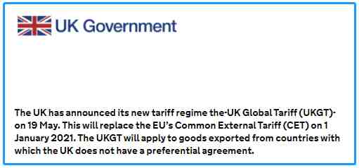 英国新的关税制度即英国全球关税(简称:UKGT)。将在英国过渡期结束时于2021年1月1日取代欧盟的共同对外关税。