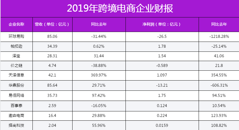 近期,跨境大卖和平台纷纷公布了2019年财报和2020年Q1财报,有的逆势增长一路高歌猛进,有的稳扎稳打品牌销量却收效甚微。跨境大卖作为行业的风向标,它们是如何驱动产品销量拔得头筹,又是在哪个领域栽了跟头,是不少中小卖家关心的。 截止目前为止,跨境通(环球易购、帕拓逊)、泽宝、浔兴股份(价之链)、天泽信息(有棵树)、华鼎股份(通拓)等跨境企业均发布了2019年财报. 在过去的一年,到底谁家的业绩最亮眼?谁家赚的最多?值得我们进行PK对比。 从净利润上来看,帕拓逊、泽宝、易佰网络取得了较为亮眼的成绩,价之链仍处于亏损状态。 跨境电商龙头企业跨境通,2019年公司跨境出口电商业务实现营业收入114.2亿元,主要来自环球易购和帕拓逊。 其子公司环球易购2019年度受国际环境不稳定因素影响在欧美市场销售业务下滑以及2019年度各项计提减值约28.7亿元,出乎不少卖家的意料。 数据显示,环球易购存货余额为14.73亿元,因全球疫情形势严重,造成海外仓库存大部分品类难以销售,利润下滑很大程度在于库存问题的优化。据公告表示,环球易购目前采购模式以买断式为主,主要根据历史销售数据、产品生命周期等进行备货。公司通过各业务环节获取运营数据,进行不同流程环节的配套算法模型开发,对存货和滞销品进行管理。 报告期内一些品类如家居用品类、家用电器类、安全防护类、母婴类、保健品、美妆类营业收入占比均比上期增加。特别是安全防护类占公司营业收入2.33%达到4.17亿元。 同为跨境通子公司的帕拓逊的盈利能力也正在不断提升,2019年更是以34.39亿元的营收斩获了1.78亿元的净利润。 值得一提的是,跨境通正在不断关注其经营性现金流管理情况、自有品牌发展和技术研发。从报告上来看,在自有品牌方面,跨境通围绕渠道品牌和产品品牌两大维度深入打造公司品牌化运作能力,一方面持续加强Gearbest、ZAFUL等重点渠道品牌建设,另一方面公司全面加强自有产品品牌的打造,公司旗下运营含战略品牌、核心品牌以及扶持品牌近200个,报告期内公司自有品牌营业收入达到669,458.23万元,占整体营业收入的37.45%。 易佰网络在2019年实现营业收入 35.78亿元,净利润较上年同期增长 94.51%。在销售区域上,美国、德国和英国,分别以主营业务收入占比20.30%、12.31%和11.70%获得前三名。 其七大品类收入均实现同比增长,其中工业及商业用品、汽车摩托车配件同比增幅超过 100%,其他主要品类的平均增速也超过 85%,表现出良好的增长势头。 能够如此高速增长,更多是因为易佰网络抛开红海市场的品类,优先切入并不断深耕家居园艺、健康美容、汽车摩托车配件、工业及商业用品等蓝海品类,打下一片属于自己的市场。 当然其他跨境企业的表现也是可圈可点,其中,根据遨森电商发布的2019财报显示,全年实现营业收入16.4亿元,较 2018 年度增长了 29.88%,基本达到了公司的年度预定目标,净利润较上年度大幅度增长。 数据显示,遨森电商在户外系列(41.31%))、居家系列(33.52%)和健康休闲系列(16.52%)占营业收入比重最高。 面对日益激烈的市场竞争,大量跨境电商企业涌入,传统贸易企业及物流企业均纷纷试图涉足跨境电商行业,遨森电商利用自身在海外广泛布局的优势,充分利用海外子公司和海外仓,将主要资源集中投入到大数据分析、采购、销售、仓储配送、客户服务等各环节,形成以信息化系统为核心的公司业务完整链条,建立领先的信息化管理系统和跨境电商全产业链的深度布局,形成先发优势及规模效应,增强公司业务竞争力。 相比于以上几家,价之链母公司浔兴股份也公布了2020年第一季度的业绩预告,公告中表示,该公司在2020年第一季度亏损了800万-1100万,而去年同期亏损是622.06万。 据公告显示,其公司业绩亏损,主要总结了两点原因: 1、一季度为拉链业务的传统淡季,加上新冠肺炎疫情影响,公司拉链业务收同比下降,亏损同比增加; 2、跨境电商业务一季度营收同比略有增长,同时受益于人民币汇率波动带来的汇兑收益,公司控股子公司深圳价之链跨境电商有限公司业绩亏损同比有所收窄。浔兴股份在2019年财报中提到,报告期内,子公司深圳价之链跨境电商有限公司调整经营策略,强化周转、提升毛利率,营业收入同比减少约29,700万元,降幅38.37%,但毛利率较上年同期提升4.22个百分点,销售费用也有所下降,经营亏损较去年同期有所收缩。 截止目前为止,亚马逊、eBay、Shopee和Shopify平台的2020年第一季度财报已经出炉。 亚马逊:2020年第一季度营收754.52亿美元 财报显示,2020年第一季度,亚马逊营收为754.52亿美元,较去年同期的597.00亿美元增长26%。净利润为25.35亿美元,较去年同期的35.61亿美元下降29%,每股收益5.01美元,不及预期。 亚马逊在在线零售和云领域的领导地位使其成为新冠病毒大流行期间的领头羊。但总结来说,亚马逊的收入增加了,利润却减少了。 Shopee :2020 第一季度订单增长111.2% Shopee第一季度斩获傲人业绩,营收达62亿亿美元,同比2019年第一季度增长74.3%,稳居东南亚与台湾市场的领先地位。 根据财报显示,Shopee第一季度总订单数同比增长111.2%;在东南亚最大电商市场印尼,更凭借Q1逾1.85亿的订单量,稳拿东南亚头部市场印尼最大电商平台头衔。同时,Shopee 4月订单量较去年同期增长140%以上。 eBay:2020年第一季度净营收23.74亿美元 财报显示,2020财年第一季度,eBay