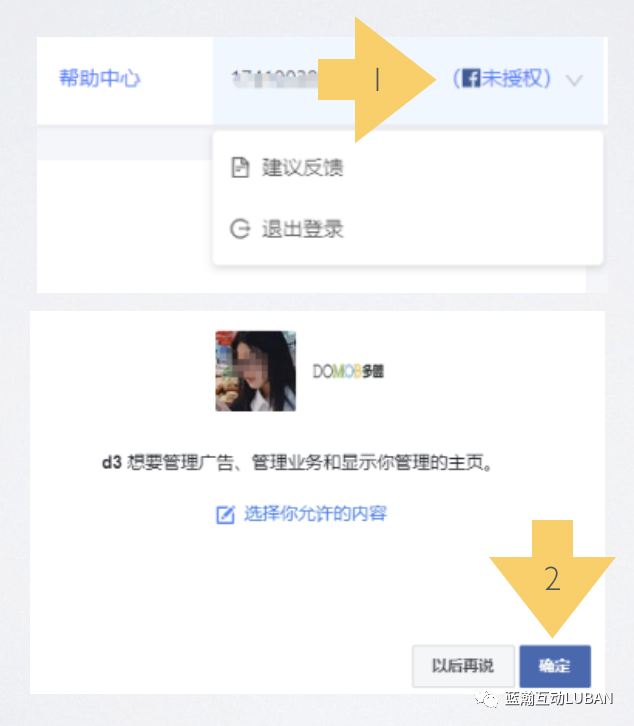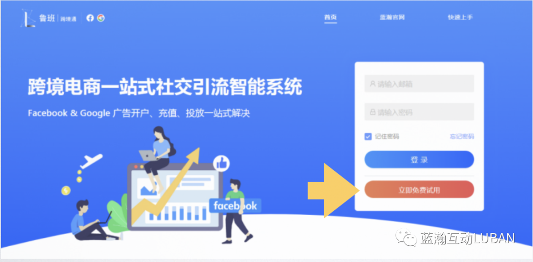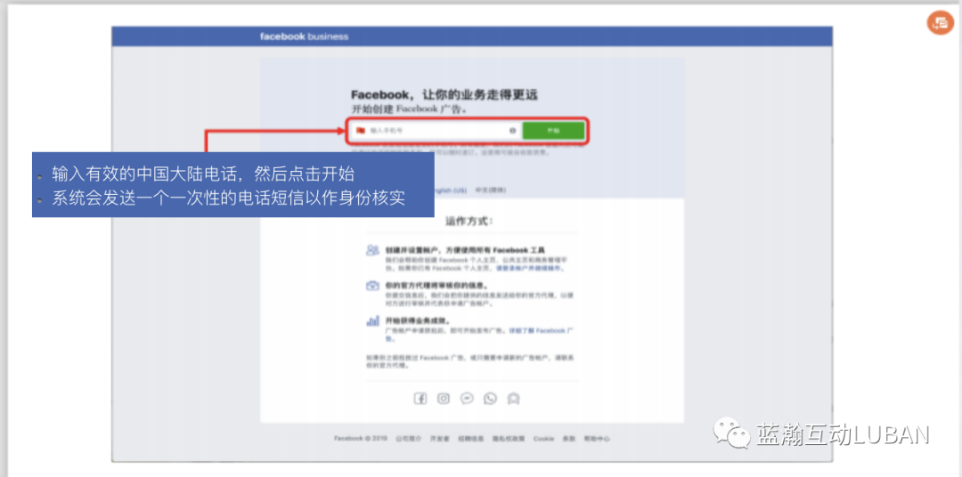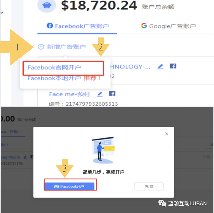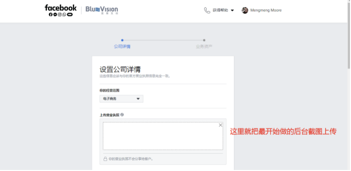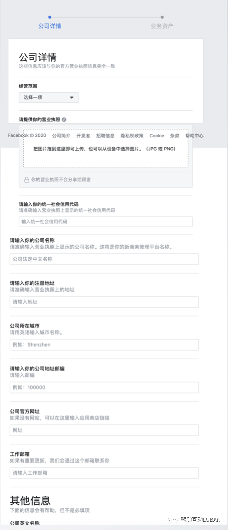 1.进入商务经理给您的平台注册链接 https://luban.bluemediagroup.cn/ 进行开户流程。 点击立即免费试用,填写公司资料进行注册 当您进入网站以后,点击右上角FB【未授权】的按钮,点击【确认】即完成授权。这时您会发现鲁班平台的功能增多。 点击左侧【首页】功能菜单中找到【新增广告账户】按钮,点击官网开户,请注意,此处需要开启VPN哦! 手机号码是大陆的就可以,之后在开户就不需要输入了。 注意:所有开户内容要完全按照营业执照上面的内容填写,语言是中文。 所有需要填写的内容都在这里,可能顺序不一样,但是内容一致。 需要填写的内容: 这里的营业执照这里需要上传的是您之前上面「准备工作」时做好的截图,切记!!! 填好之后请发截图给您的商务看一下,没问题之后再提交。然后复制一下开户的公司名称发在群里。一般3个工作日可以下户。