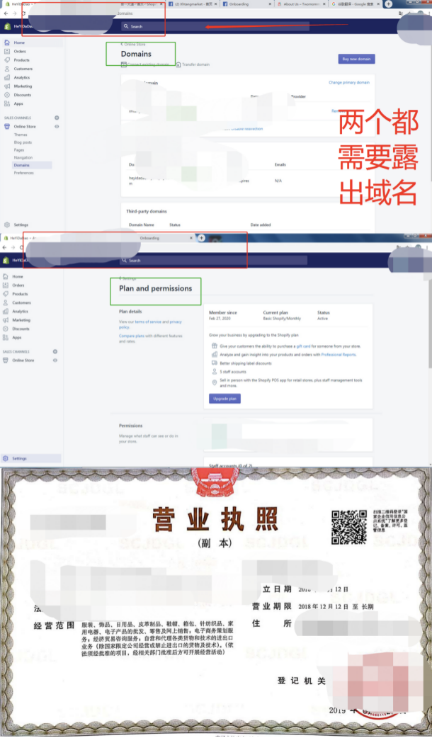 (请把您shopify后台plan and permissios层级带域名的截图与domains那页截图与您的营业执照三个拼在一起,后台截图最好是英文页面。