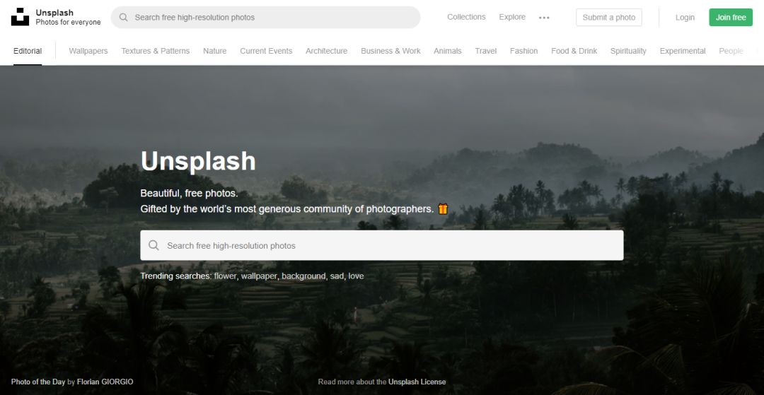 Unsplash 是一个真正免费高质量照片的网站,主打风景图片,照片分辨率也很大,用来做网页素材已经足够,该照片网站每10天更新10张照片,图片没有任何版权问题,您可以放心使用。通过图片您可以找到摄影师的Instagram地址。