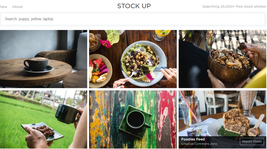 Stock Up 是 SiteBuilderReport 网站提供的一项功能,它收录了包括 Unsplash、Life of Pix、New Old Stock、Startup Stock、Jay Mantri 等21个图库网站的相片,您只要输入关键词,即可搜寻出相关结果,再从结果中找到你所需要的图片,将它复制、另存新档并运用到其他的地方。