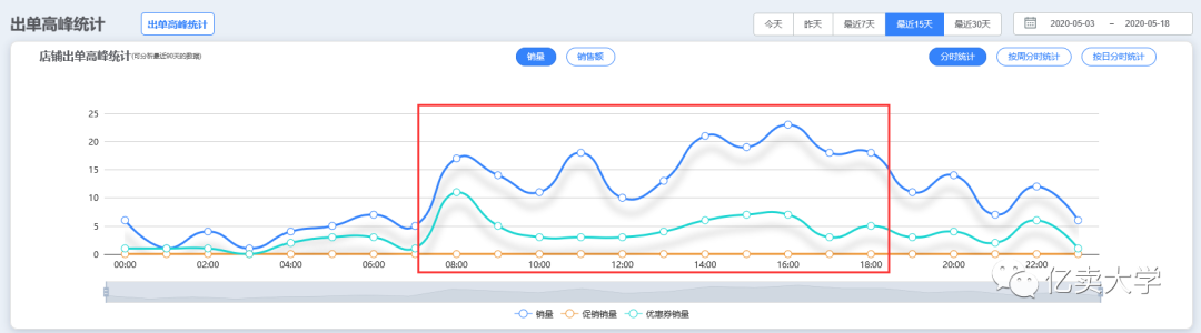 其次,我们可以考虑把广告预算集中在产品最佳时间段。怎么收集产品的出单高峰时间呢?亿数通的出单高峰统计功能可以帮助卖家统计每个产品的出单高峰期,卖家可以参考这个出单高峰,进而通过分时调价功能来控制不同时间段的广告竞价和预算,达到把广告预算集中在产品最佳出单时间段的目的。