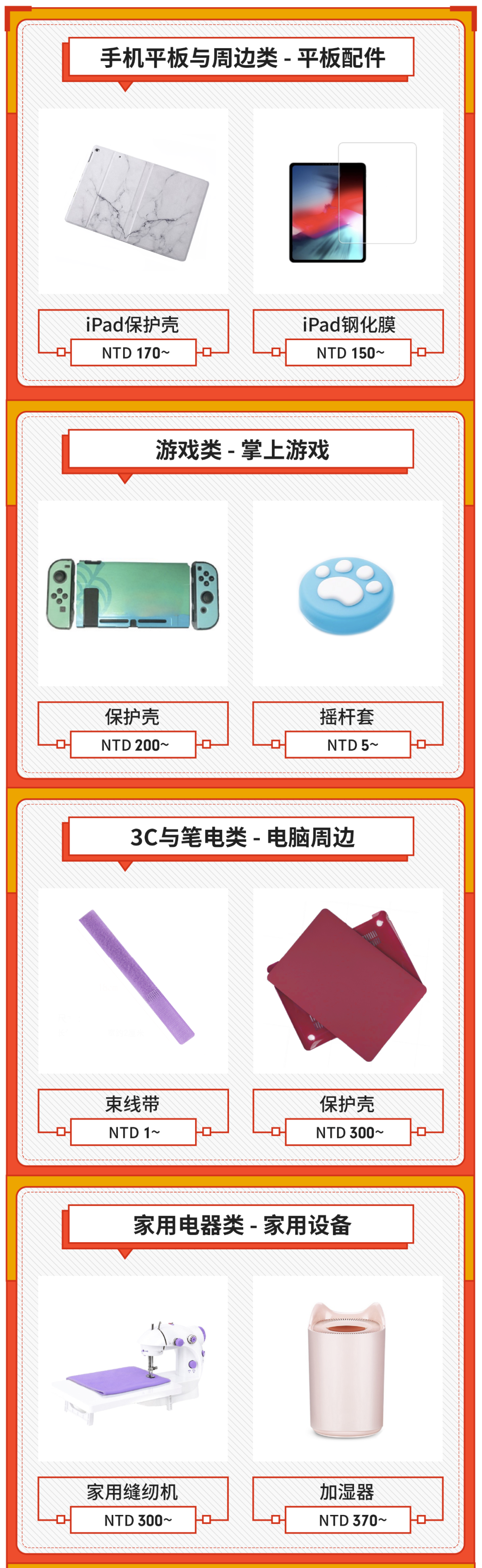 台湾市场3C与游戏增速迅猛,平板配件子类目和掌上游戏子类目GMV增长强劲,“动物森友会”更位列台湾市场疫情期消费者热搜排行榜第6位,保护壳、摇杆套等周边产品销量火爆。