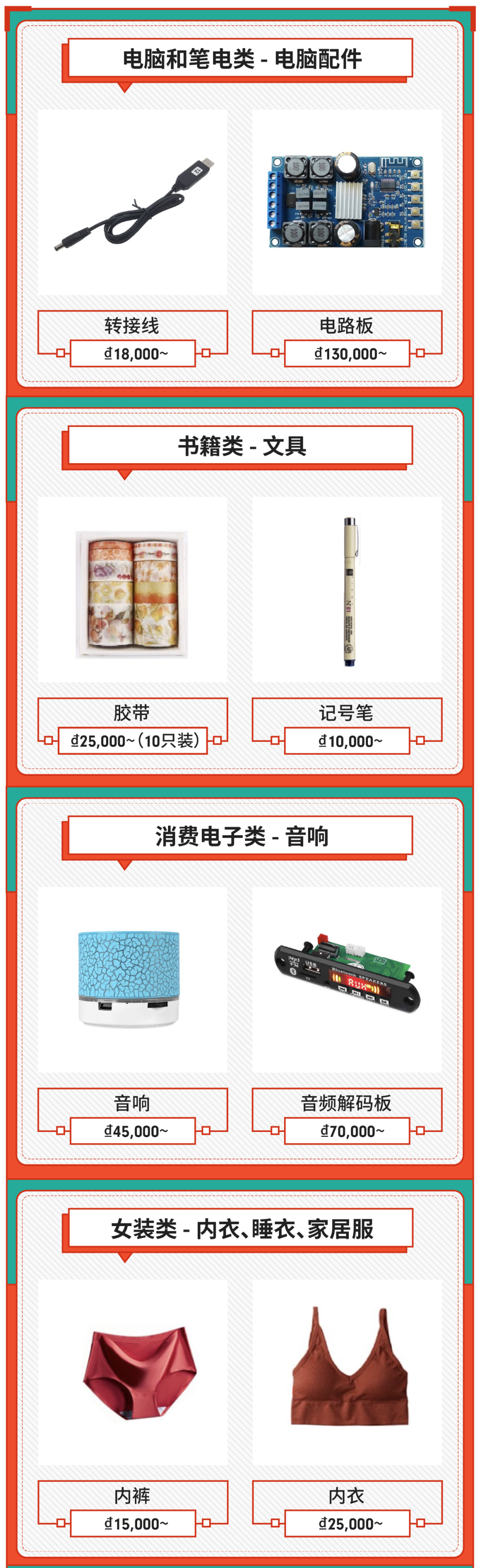 受隔离政策影响,越南市场电脑配件、文具、音响等居家办公周边热销,电脑配件子类目GMV增长超100%,跨境高性价比的转接线、胶带等产品热销。