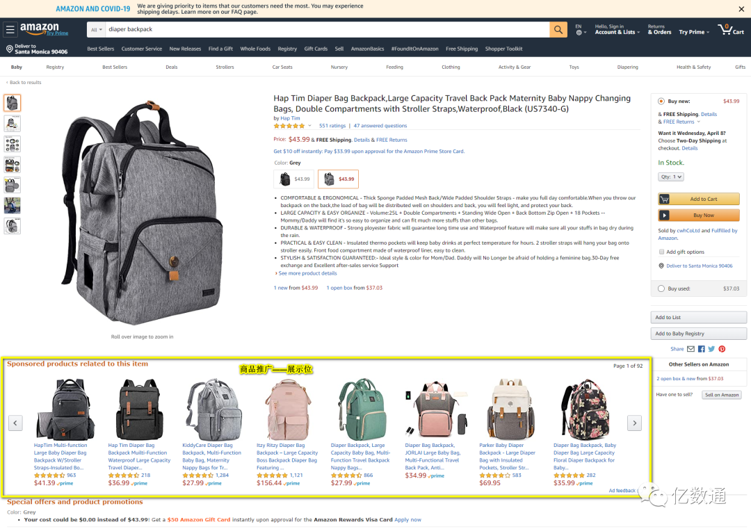商品推广在搜索页上的广告位调整不大,可是在商品详情页上,广告位从原来三行(两行“Sponsored products related to this item”,一行“4 stars and above”),变成只有一行“Sponsored products related to this item”。我们不清楚这变化是因为疫情期间的广告位调整,还是为了给展示型推广“让位”了,我们将继续跟进。