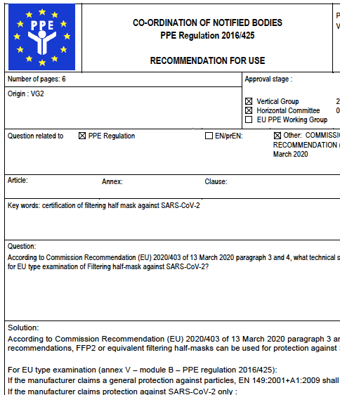 在通过Module B以后,企业可申请附录VII的Module C2。C2包括对制造厂进行年度检查、产品取样和对这些样品的测试。正常情况下,Module B+C2模式需要长达8、9个月不等的时间完成。 目前、欧洲地区开通了对B+C2的快速通道、企业可最快在2个月内拿到证书。详情请咨询英拜睿中国区/英国区负责人员。紧急通道认证RFU“PPE- r /02.075”是对技术解决方案进行所需的测试。是欧盟针对此次疫情推出的,针对关键防疫用品EN149标准的精简版。欧盟批准的RfU测试,是仅在今年内获得的有限批准。一般企业需要通过Module B型式检验才能进行下一个模块的认证,且正常情况下的个人防护呼吸口罩的CE认证可长达一年才能拿到CE证书。 通过紧急通道认证,企业可直接申请进行“PPE-R/02.075”产品测试。目前,此通道2-3周便可拿到证书。虽然目前没有相关信息明确今年的结束时间,但不排除可能政策会根据目前市场情况变化而改动。能提供此路线的NB机构并不多,现市场需求庞大,因此有意走此路线的厂家、应该尽早咨询英拜睿。我们可以协助您与NB机构之间的沟通、以及相关文件的准备。 欧盟对此路线的解释为 “此路线是目前使口罩在欧盟市场流通的快速认证路线。 在原来EN149的版本上精简了许多,并且对技术文件的要求也进行了缩减。”图:欧盟官方针对“PPE-R/02.075”的文书,列举要求。英拜睿在欧盟地区有着数十年的稳定根基,与有快捷通道认证的NB机构有着良好的合作关系。若您不了解欧盟针对口罩的认证流程以及对技术文件的要求,可联系我们的人员咨询以上3种可能的口罩认证路线,为您提供专业的技术协助。我们不仅能为您提供认证专业方面的知识解答,若您已通过CE认证,我们还有专业的本地欧盟团队,可以为您提供欧洲地区的全案营销、销售策划方案。在英国,我们也有B2C&B2B经营模式的医疗器械销售子公司;我们的医疗器械销售公司团队从业经验丰富,资源甚广,公司积累了强大的利基客户群体清单,因此我们也直接购入您的产品,进行销售合作。近日、市场监管总局发布了《关于开展口罩、防护服等防疫用品领域认证活动专项整治行动的通知》,此通知针对关键防疫用品的虚假认证、虚假检验等问题做出了指示,大力打击了前段时间市场泛滥的假CE,FDA,以及检验报告等问题,提升了整个市场产业链的合法性,正规性,及产品的安全性。另一方面、尽管因为疫情所迫、欧美地区针对进口防疫物品的认证标准开展并实施了一系列的助力措施。例如上述提到的欧盟市场认证标准的的绿色渠道,降低对认证标准的要求等。其程序繁多及复杂的质量认证标准对非专业人员来说,知识缺口一时间仍难以弄懂,这些空隙都为非法认证机构提供了可利空间。虽然如今相关部门正在逐步加强对认证市场监管力度,口罩制造商以及外贸商仍然应该对非法认证机构保持警惕。制造商需要知悉的是,防疫用品出口的质量和程序是否合规不仅关乎企业利益,更是关乎我大体的中国制造形象,因此通过正规认证机构及渠道进行认证,技能在保障产品质量、满足市场流通条件,又能维护我国产品质量的形象。另确保在提交申请之前,向专业人士咨询,能加快通过认证的流程,突破语言和技术要求等方面的障碍,保证产品能在第一时间流向市场。