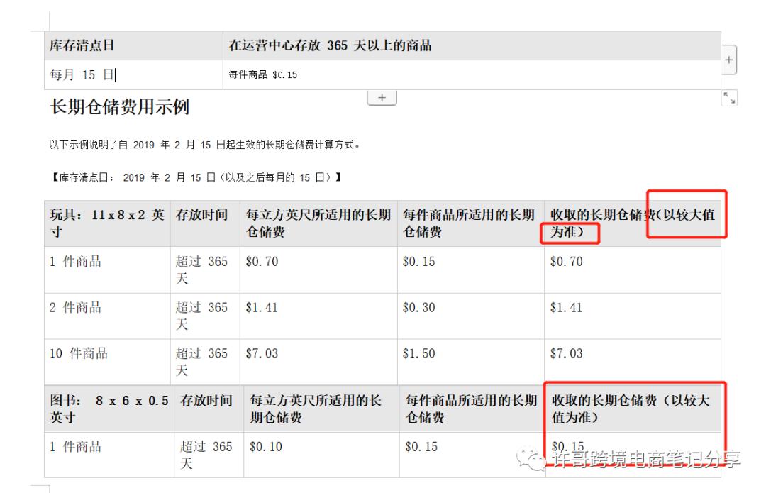 此日,在(亚马逊)运营中心的存放时间超过 12 个月(含 12 个月)的商品,亚马逊会按每立方英尺 $6.90 或每件商品 $0.15 的标准评估长期仓储费。