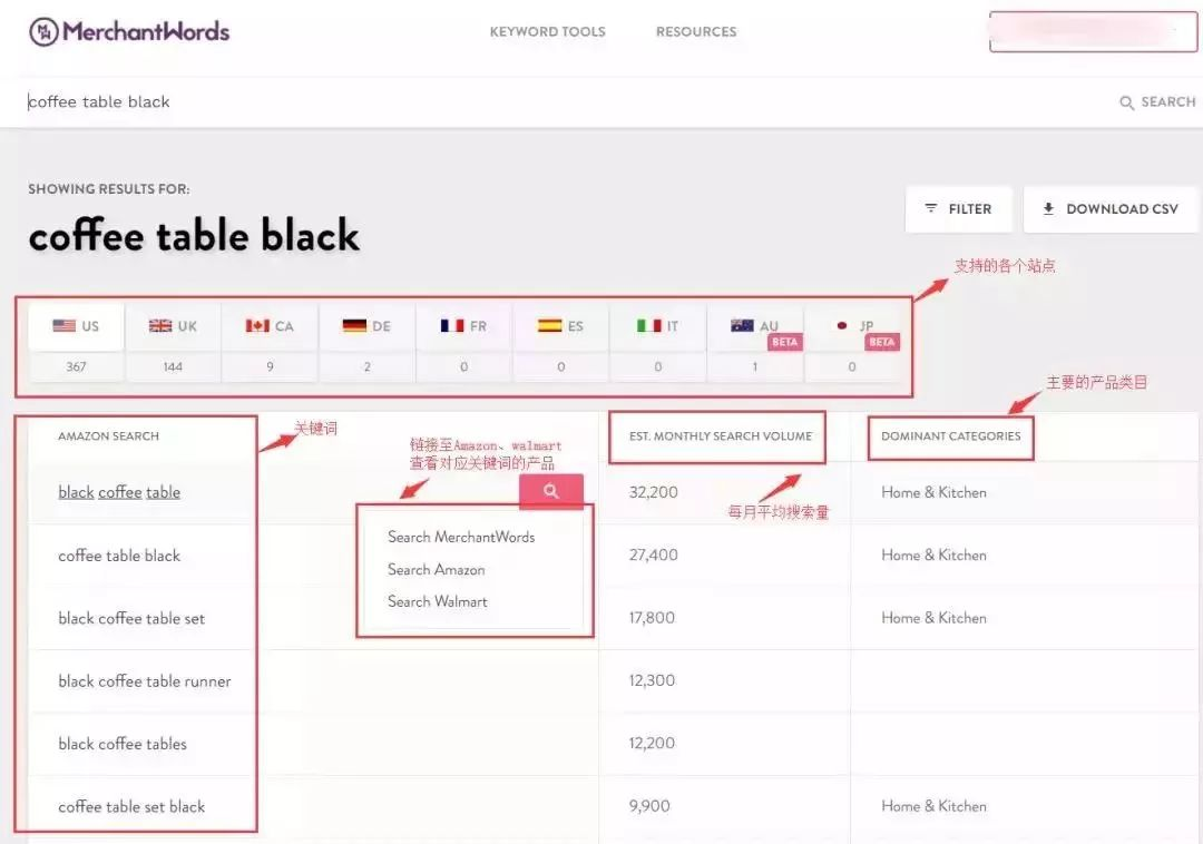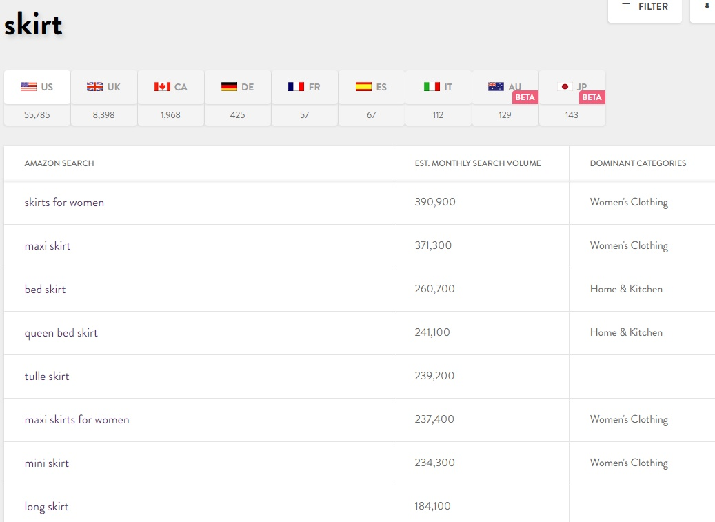 通过Merchant words提供的参考关键词可以增加发现新产品的机会,除了显示搜索量,Mechant words还会按搜索量排名,并附上与该词相关的词语,比如搜索skirt就会出现如下图的结果。
