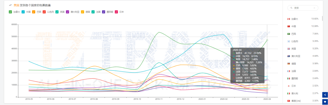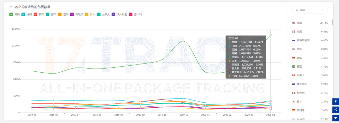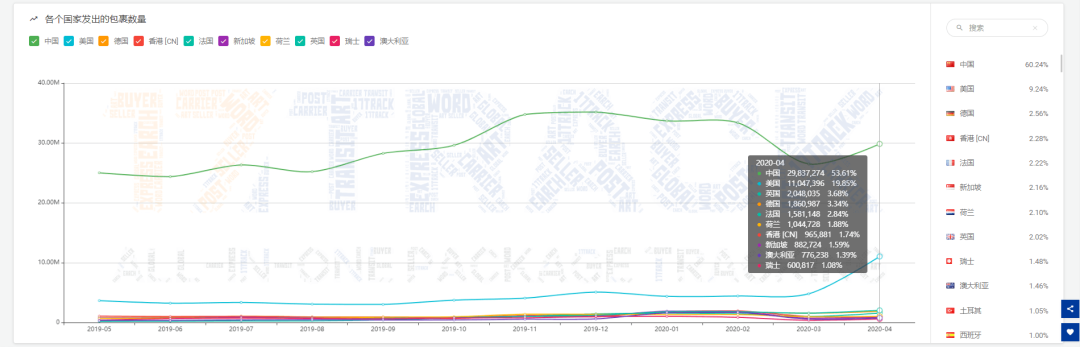 疫情在全球蔓延后,国内不少外贸企业的订单被削减,有的甚至被取消,外贸出口、跨境电商面临严峻考验。海关最新的数据却令人惊讶,4月份的出口同比出现了8.2%的增长;由17TRACK收录的全球跨境包裹数据分析显示:4月全球包裹量同比增长43.6%,外贸复苏迹象明显。本期咱们一起回顾一下4月份的包裹数据:环比可以看到,4月份各个国家发出的包裹数量较3月份增加了1,200万、涨幅达到了27.3%;同比增长更是非常的明显,增加了1,700万、涨幅高达43.6%;虽然目前全球的疫情仍较为严峻,但就2019年与2018年同比增长600万、涨幅18.2%相比,今年的数据还是异常的夺目。