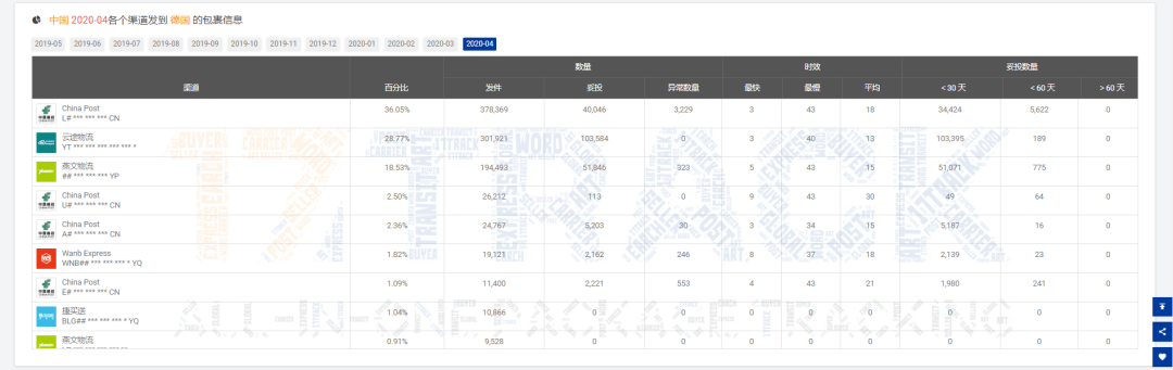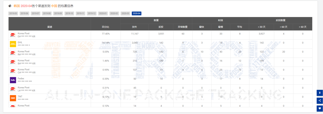 2020年4月,平台总共收录查询单号超过5,566万票,其中发件的国家及地区为217个、收件的国家及地区为226个。