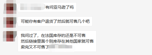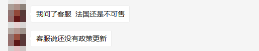 随后卖家表示从客服处得到的回复是:在法国库存的还是不可售,然后链接里面个别库存在其他国家就可售,卖完又不可售了。