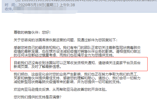 随后有不可售的卖家去开case问了客服,客服表示还没有收到法国站可以正常收货发货的相关通知,希望卖家继续关注卖家平台及后台新闻页面。