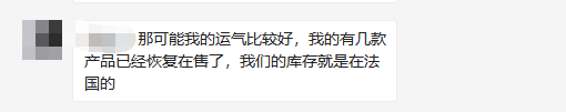 商品仍然不可售已经很难过,还有欧皇卖家出来给非酋卖家致命一击,表示自己的产品不仅恢复可售,且库存就在法国。这意味着只要有订单就可以迅速发货。