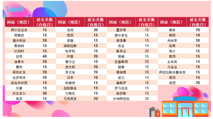 以上53个路向目的国的订单释放后,若在(X+上述延长天数)个自然日内确认妥投,商户将无需承担与物流相关的订单退款责任。各国的X值请访问 https://merchantfaq.wish.com/hc/zh-cn/articles/204530018 查看。以上未列出的其他所有路向目的国的订单仍需遵守现有的、未调整的商户政策7.5条(访问https://merchant.wish.com/policy/refunds#7.5查看政策说明)。