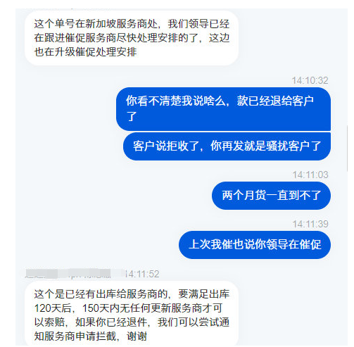 近期有某卖家爆料,他在3月份通过某大型物流公司发新加坡邮政挂号小包,到了5月份货物仍然在国内,并且最后客户都拒收退款了,卖家去找物流公司客服请求将货物退还给他,却被告知货物正在等航班退不了。卖家请求给予赔偿,客服却说要等150天无任何更新才可以索赔。