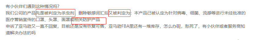 还有卖家表示:产品先被判为杀虫剂,删除了敏感词后又被判定为口罩等防护产品,申诉得不到回复,还剩一堆的库存,愁死了。