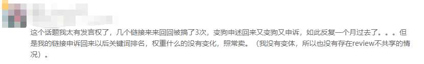 更有卖家表示:这个话题我太有发言权了,几个链接来来回回被搞了3次,变狗申述回来又变狗又申诉,如此反复一个月过去了。幸运的是这位卖家在链接申诉回来后关键词排名、权重等没有变化。