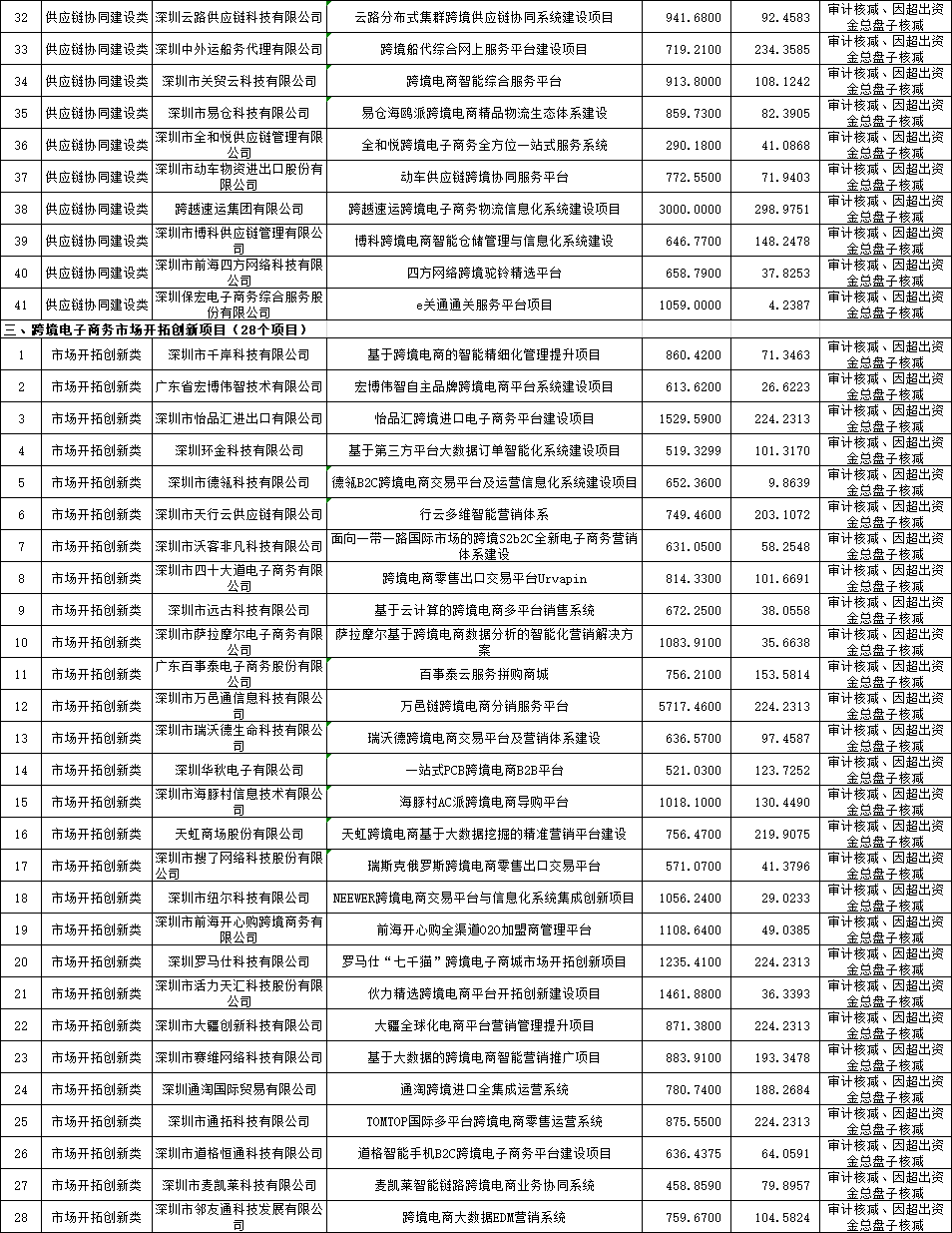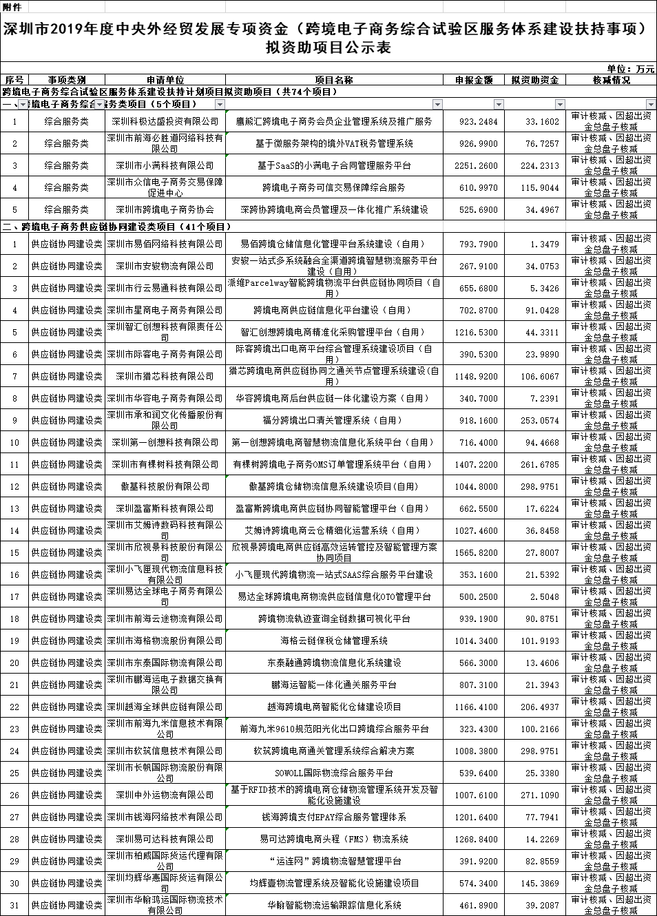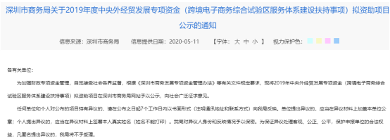 5月11日,深圳市商务局发布了关于2019年度中央外经贸发展专项资金(跨境电子商务综合试验区服务体系建设扶持事项)拟资助项目公示的通知。
