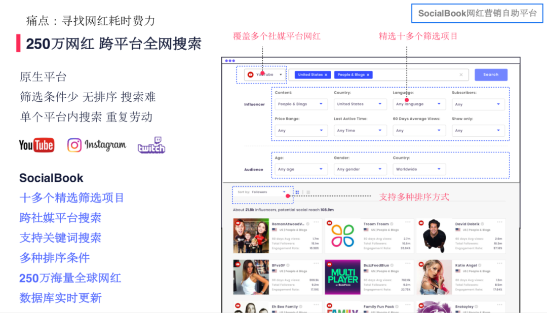 通过SocialBook你可以对营销策划内容的评估来对网红进行类别、语言、国家、粉丝人数、近期活跃情况以及粉丝画像的圈定,这样一来可以一次性划定范围,避免大海捞针似的一个个查看,毕竟全球网红千千万,一个个的排查只会增加操作的时间成本,并不能使自己的时间花在刀刃上。