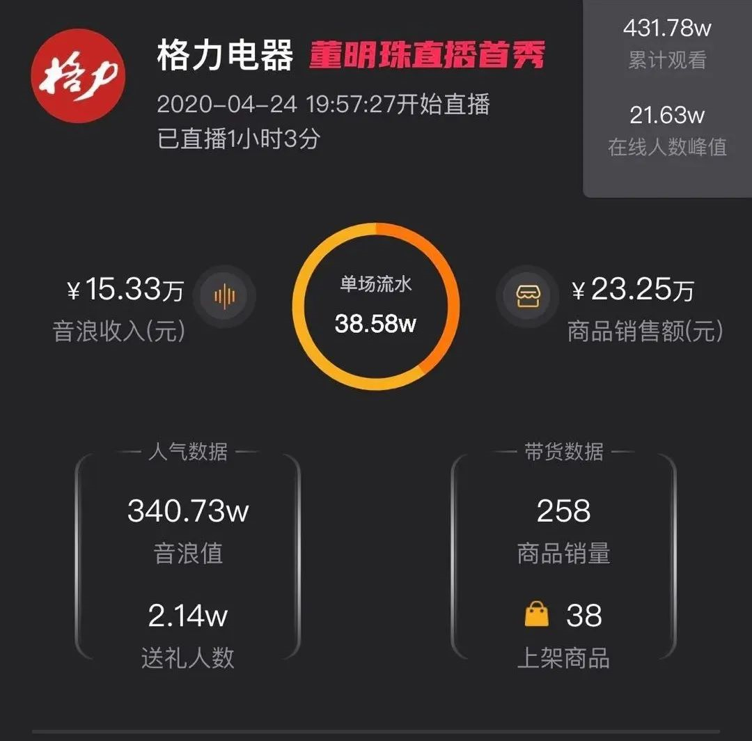 不过,这场直播似乎有点“崩”了,画面多次卡顿、中断,网友一直在喊“卡卡卡,太卡了...”。随后数据显示,董小姐这1个小时的直播带货,累计有432万观看,卖了22.53万元,38件产品中有17件颗粒无收。其中,销量最高的产品,是售价139元的充电宝,也仅卖出125个。