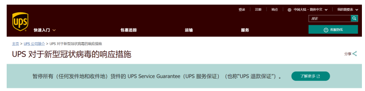 另外,近日UPS还发布了一则公告,公告中提到:将暂停所有(任何发件地和收件地)货件的UPS Service Guarantee, 即UPS服务保证,也称“UPS退款保证”。