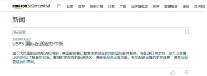 近日,有亚马逊卖家晒出后台的一则新闻——USPS国际配送服务中断。