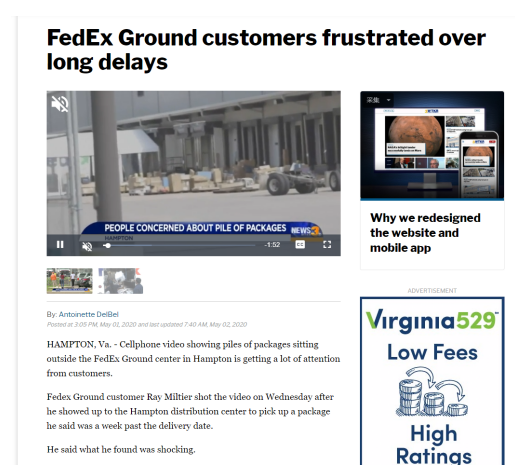 据国外电视台:wtkr news 3报道,成堆的包裹坐在汉普顿的FedEx地面中心外,吸引了众多客户的关注。