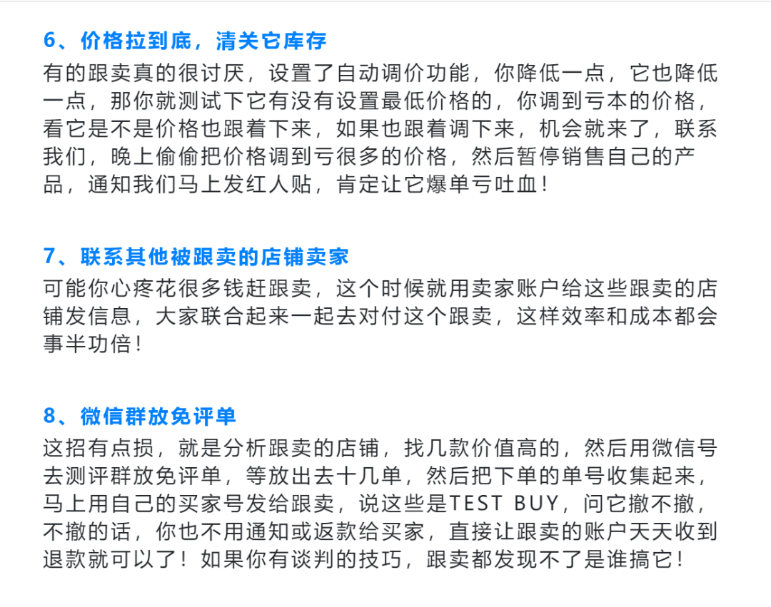 半夜偷偷改下LISTING详情或则替换掉产品的图片 ,然后暂停销售自己的产品,当然前提是产品要有销量,这样让跟卖不知不觉中卖出几十单,肯定就有自然买家投诉它货不对板了,自然它就被暂停销售LISTING了!