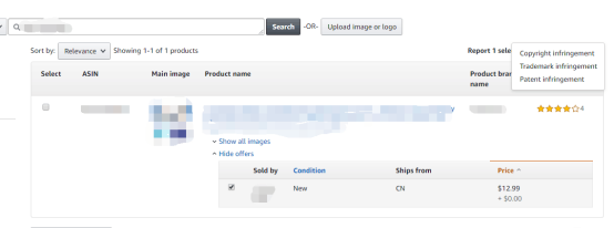 3). 输入找到被跟卖的产品链接,点击show offers, 勾选要投诉的卖家,然后选择Trademark Infringement。注意,一定要勾选跟卖卖家,不要勾选ASIN前面的那个框哦,否则整个ASIN都可能被移除。