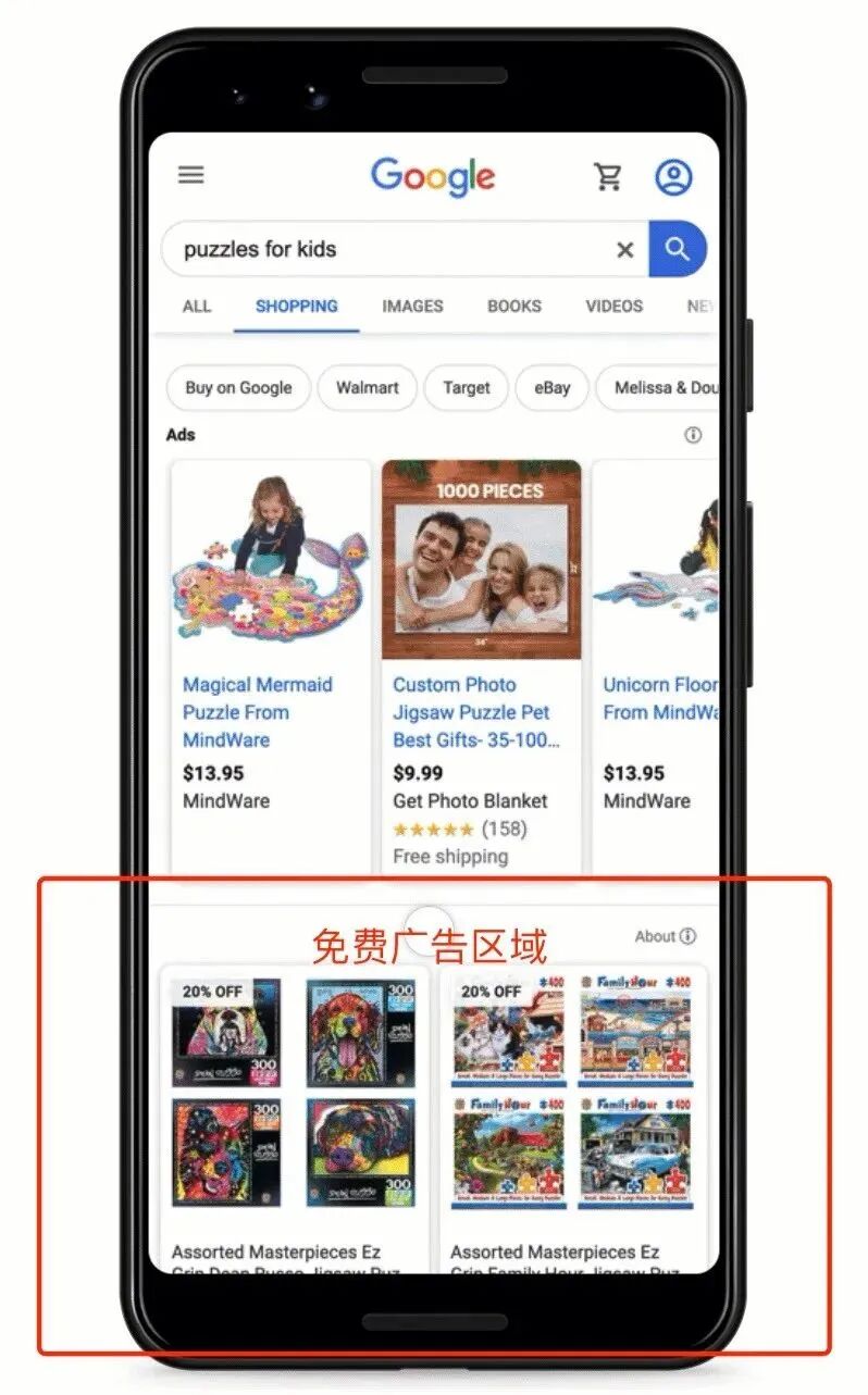 谷歌购物广告,即Google Product Listing Ads(简称“PLA”),是用来吸引消费者和新客户的关键手段之一。PLA可为消费者提供购物所需要的相关信息,如价格、图片、产品名称和商店名称等,详细的信息可促使消费者提高购买率,PLA转化率比文字广告高30%。 Adthena的研究显示,通过对超26万家零售商的4000万个搜索广告数据分析,PLA大多情况下主导零售搜索营销。在美国,PLA广告花费占总付费搜索广告花费的76.4%,而在英国则达到了82%。 开放免费广告区域对于跨境卖家来说,无疑雪中送炭!无须花钱便可获得每日数百万的曝光量!而那些如果原本就有Google Shopping广告投放的卖家,则可获得叠加的双重广告效果。