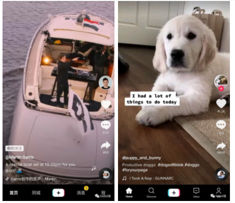 Tiktok的国际版主界面看起来会和国内的抖音非常相似。接下来,我们来看一下抖音的具体界面,做对比分析。