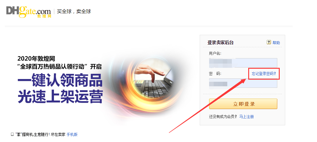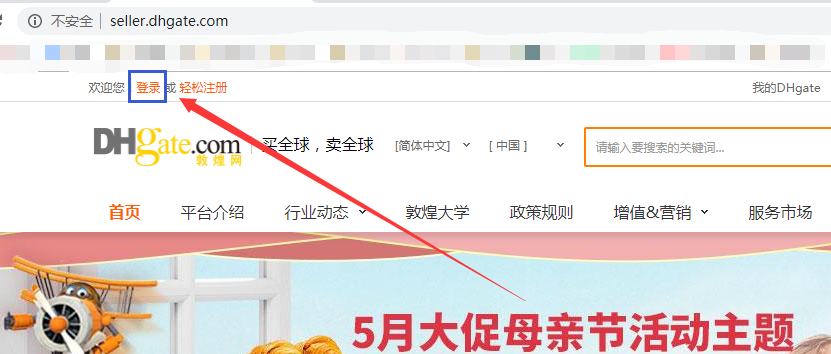 打开敦煌网卖家站(http://seller.dhgate.com/),点击各处“登录”入口。