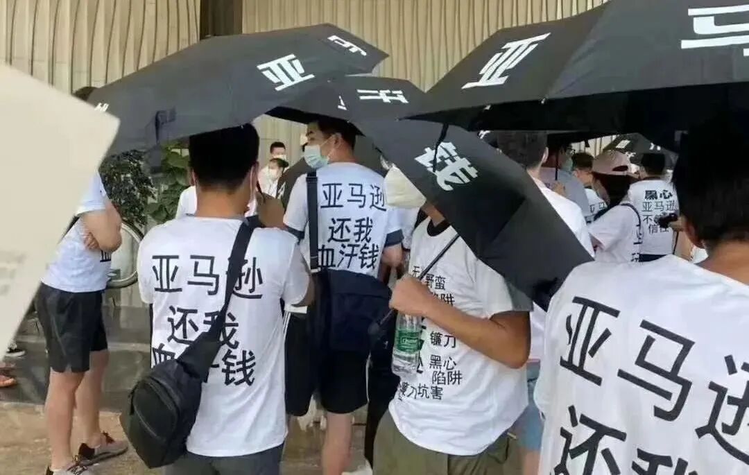 最近,又出现了类似的情况。深圳一批亚马逊卖家聚集在南山来福士广场,每个人都身穿黑字白T,打着白字黑伞,上面各印着“亚马逊还我血汗钱”“亚马逊跟卖漏洞嫁祸卖家”等触目惊心的字眼。原因是他们售卖防疫用品导致账号被冻结,并且亚马逊永久不打款。