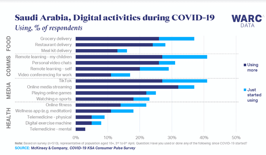 沙特阿拉伯的消费者正在转向TikTok,远程学习,杂货店交付和在线媒体。麦肯锡公司的一项调查中,超过三分之一的受访者表示,他们目前在这些领域的使用频率越来越高。