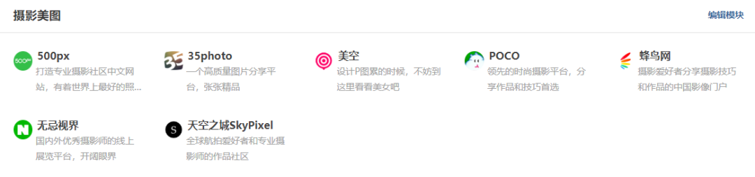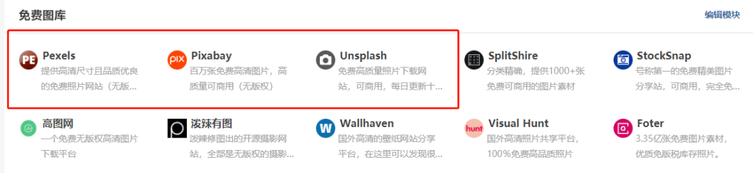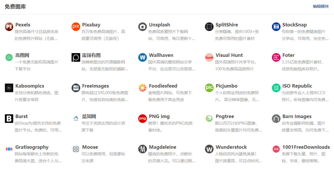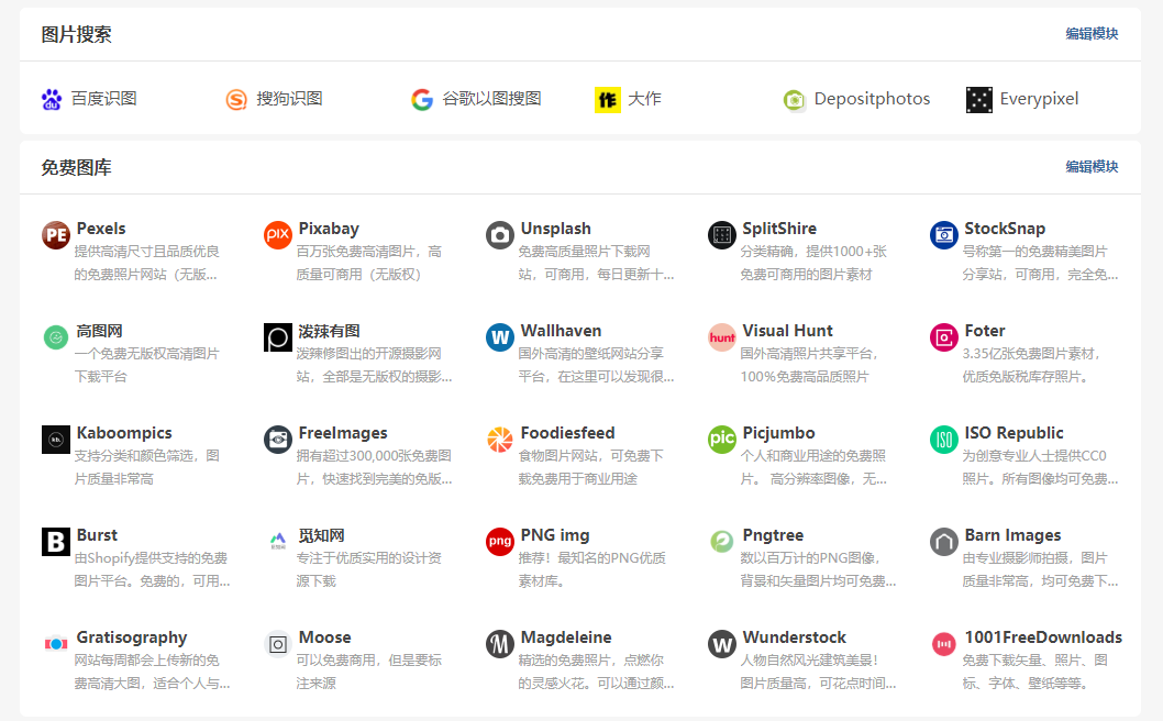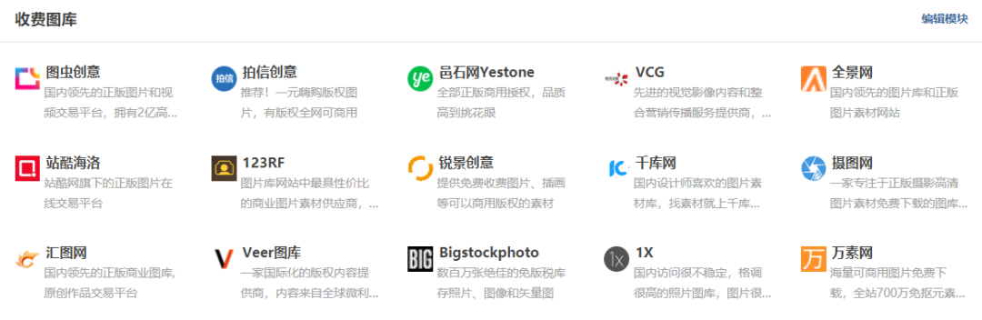 除了版块分类,每个版块内的图片网站都有对应的图标与文字简介,一目了然,一键点击直达,方便卖家根据自身需求进行快速的选择。